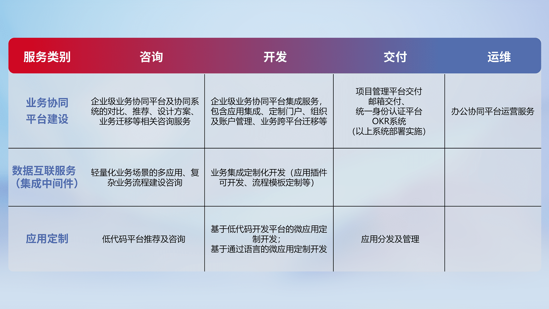 针对钉钉、、、企微、、、IDaas等平台级产品提供产品的规划、、方案、、、交付、、定制化开发等服务,,,,实现如统一协同办公、、智能客户服务、、、混合会议管理、、、智能数据查询、、、等业务场景,,,实现数字化转型。。。。