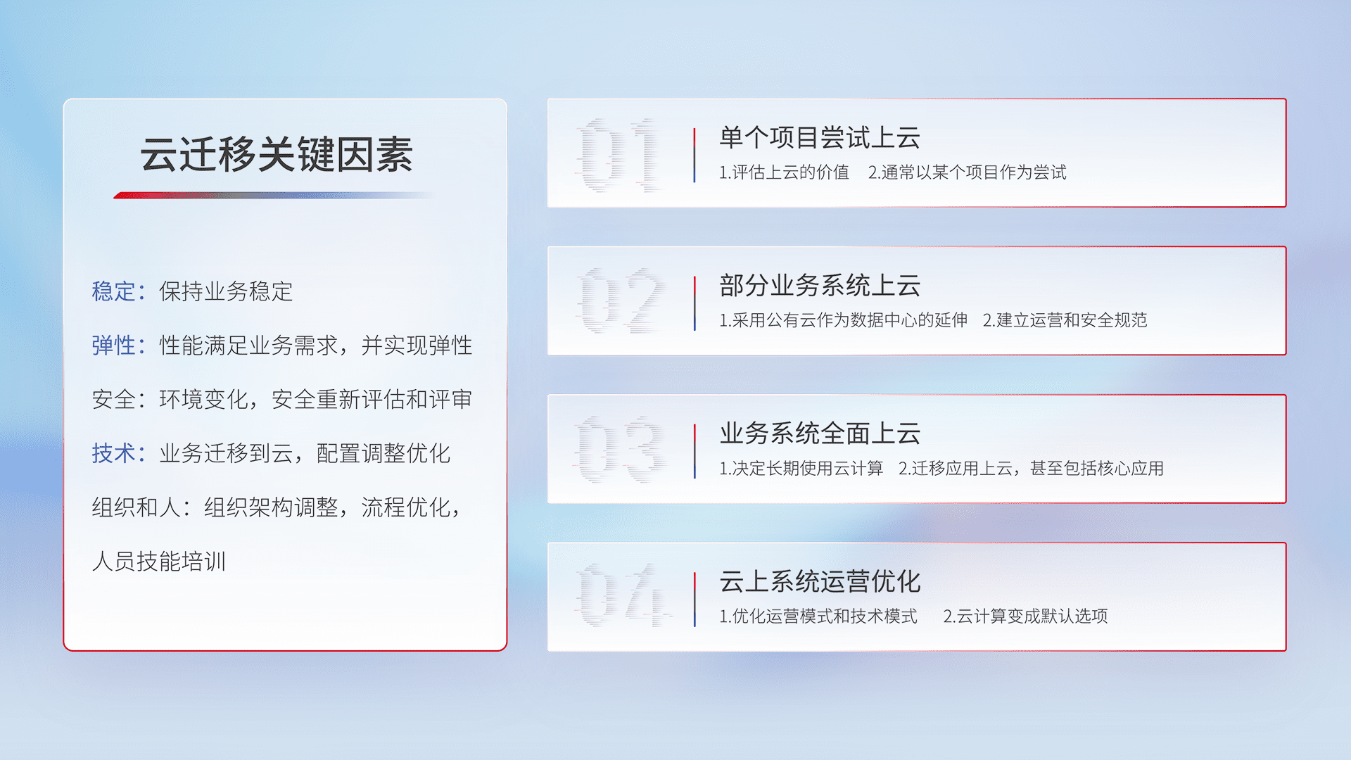 结合实际业务,,,从规划设计、、、、云平台选型、、、云原生改造、、、、数据迁移、、、集成交付,,,迁移全过程为客户识别最佳上云路径,,做好风险识别管理,,,,设计网络架构、、、身份权限、、、、安全审计合规、、、、操作审计、、、日志审计、、监控告警策略、、、、多站点容灾设计等,,,对云上基础设施进行整体规划,,,,提升IT治理水平,,,,以满足弹性、、、、高可用、、、高性能的需求。。。